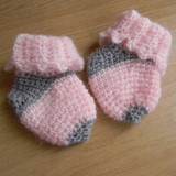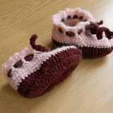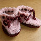 Резинка и носок связаны основным бордовым цветом, средняя часть носка-чередуя бордовый и фиолетовый цвет.Пинетки (основную часть, без декора) вязала по описанию, которое указано в этой ссылке.