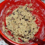 Добавить разрыхлитель и муку, замесить не очень крутое тесто.Накрыть миску пленкой и поставить в холодильник на 1 час (для того, чтобы хлопья "разбухли" и стали мягче).