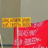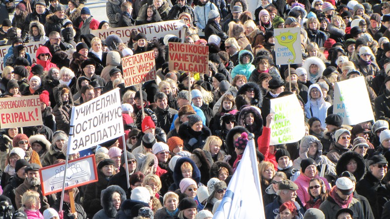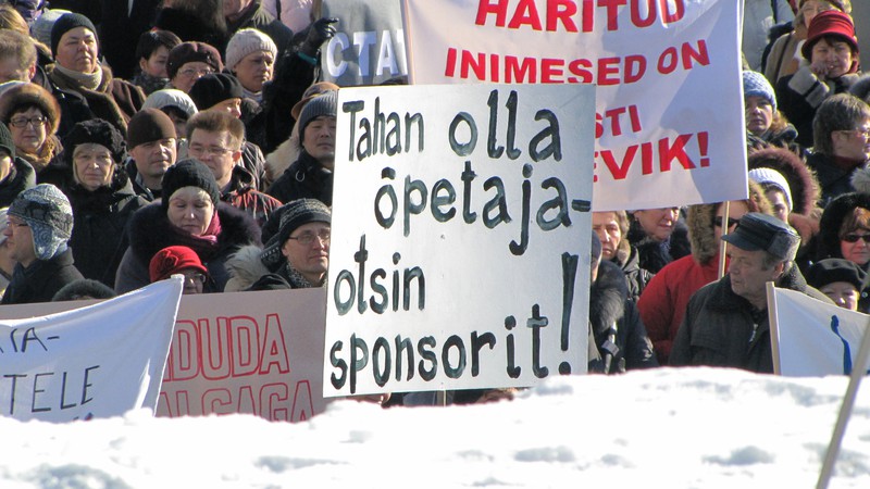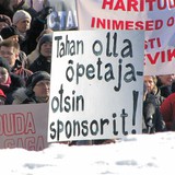 Митинг в Таллинне. Учителя выдвинули 6 требований, одно из них - поднять зарплату по меньшей мере на 20 процентов в этом году и к 2014 довести до средней по Республике. Второе требование - сохранение системы аттестации учителей и введение минимальных ставок общереспубликанских зарплат учителей.Третье требование - уравнение минимальной ставки учителей детских дошкольных учреждений с минимальной ставкой учителей основной школы и гимназии. Четвертое требование - уравнение отпуска учителей детских дошкольных учреждений с отпуском других учителей — 56 календарный дней.Пятое требование - установление для педагогов 18 уроков, в объединенных классах — 16 уроков в неделю. Введение зарплаты классного руководителя — по меньшей мере 25% от минимальной ставки зарплаты.Шестое требование - гарантировать педагогам компенсацию переработок. Площадь Свободы.Зарплата в Эстонии 640 евро, а в Греции - 1700, давайте поможем Греции. Митинг. Хочу быть учителем - ищу спонсора. Митинг.