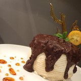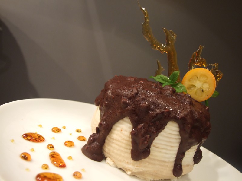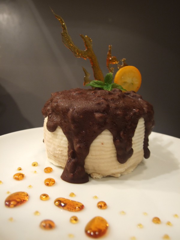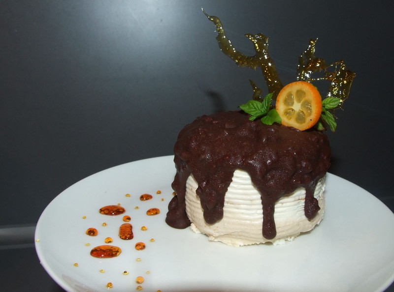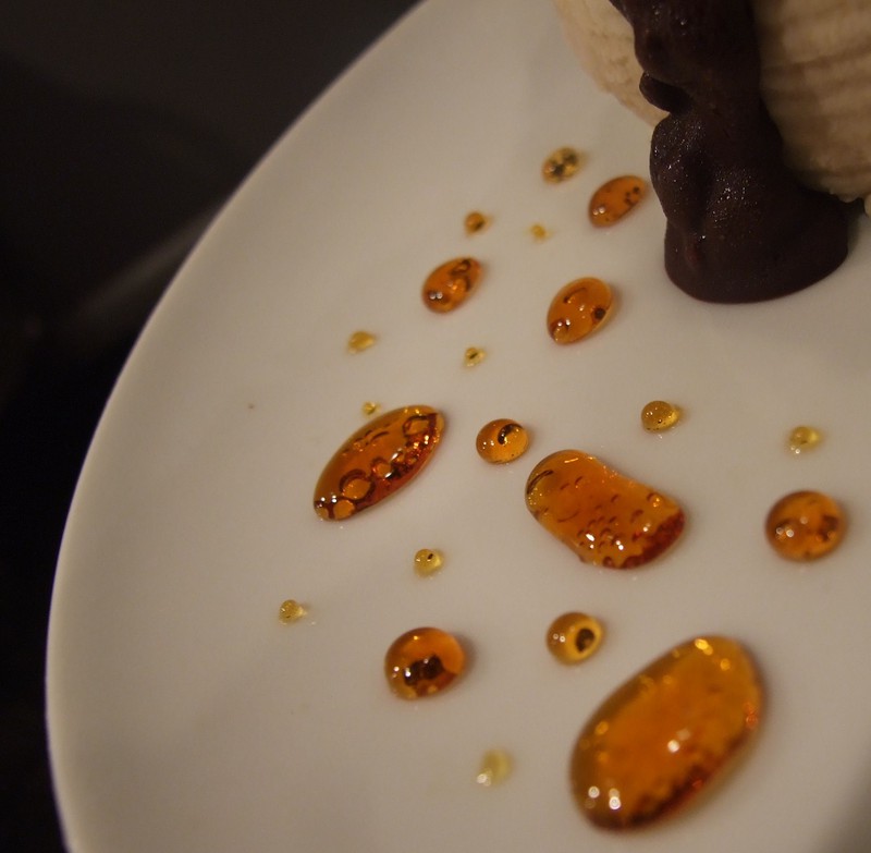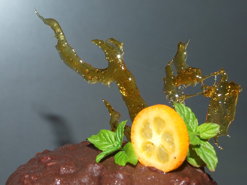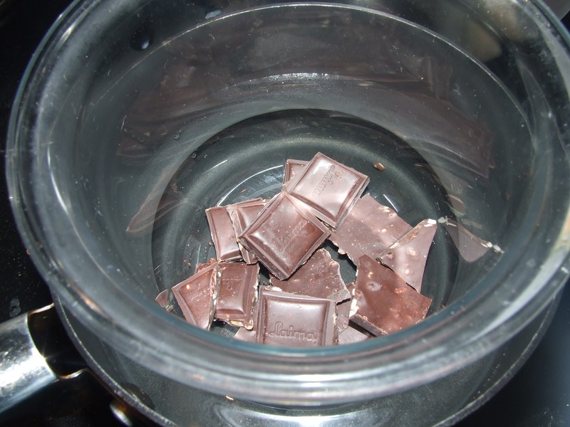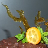 Пока пирожное в холодильнике плавим шоколад. У меня чёрный с ягодами и орехами.И немного сахара.Дав шоколаду немного остыть заливаем наше пирожное.И украшаем. Немного перечной мяты придаст свежести.Сахарные янтарики.Ну вот, как то так.