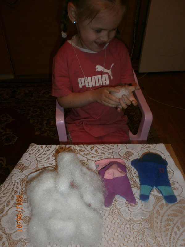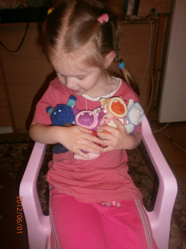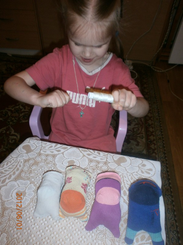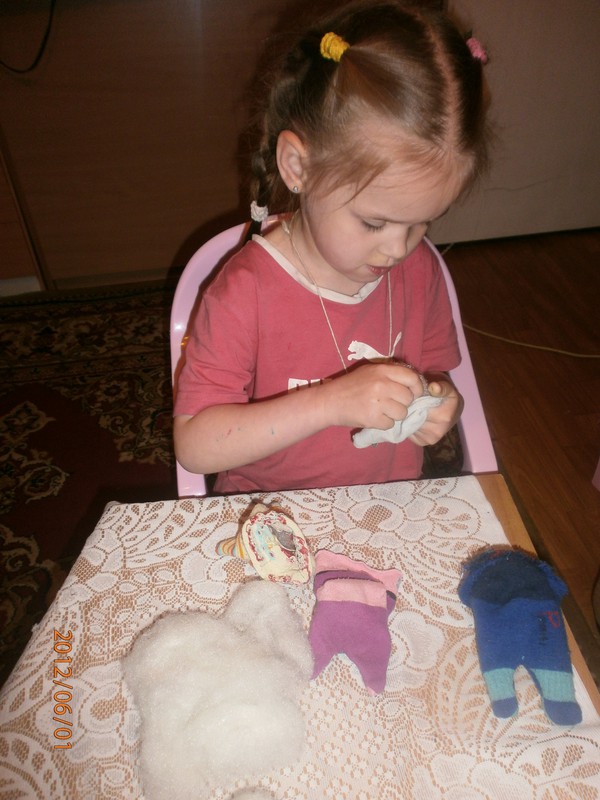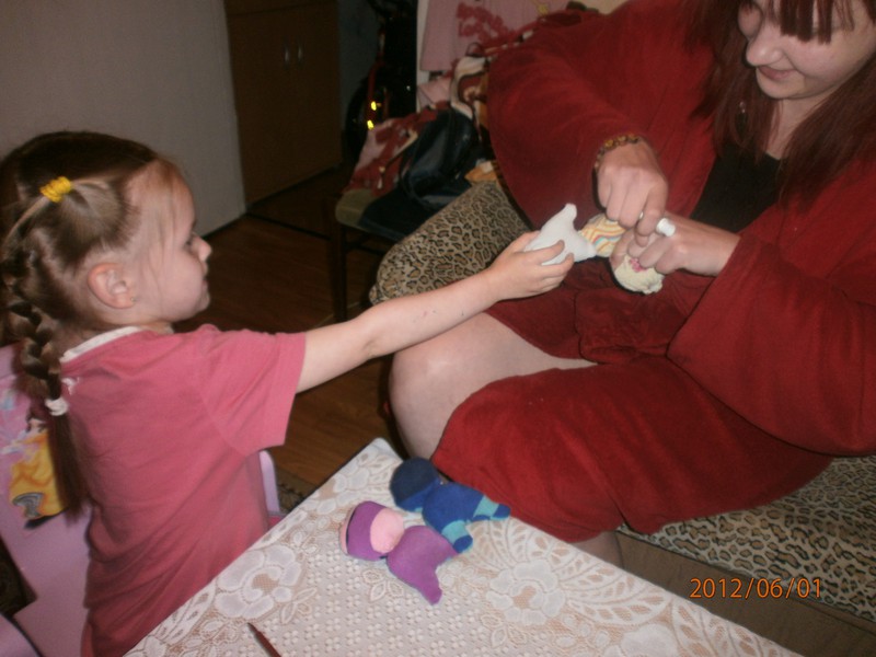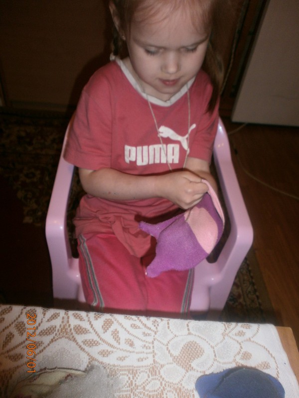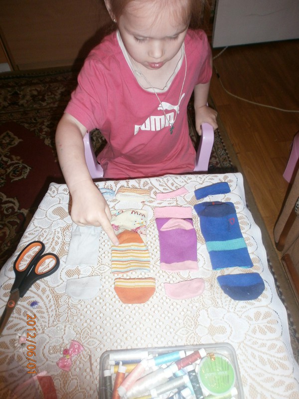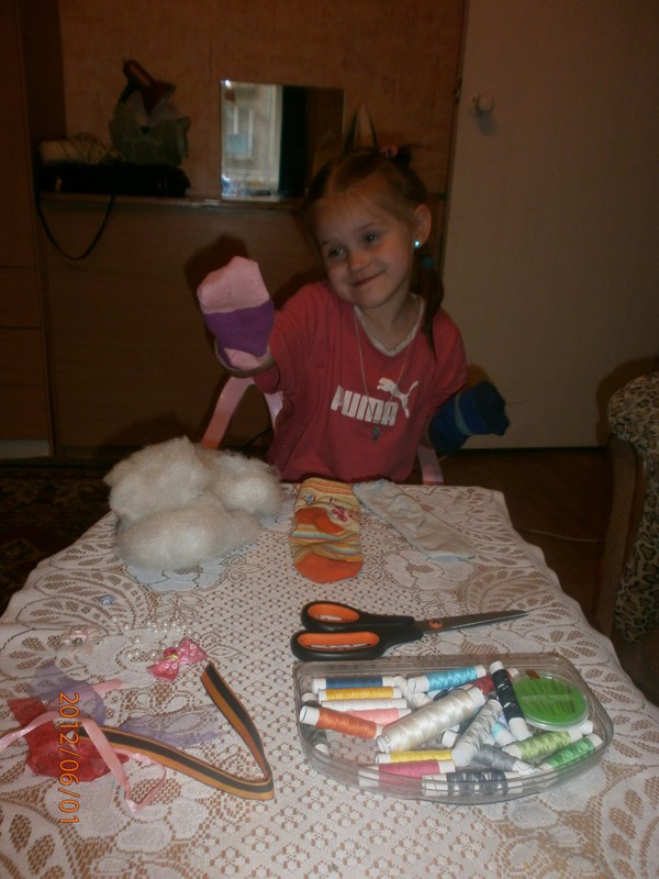 Для игрушек нам понадобились носки,ножницы,иголка с нитками,синтепон,ленты,бусиныГотовы приступить к творчеству!Разрезаем носки на 3 части.Все части пригодятся.Вырезаем ушкиВыворачиваем наизнанкуВыворачиваемИ пришиваем разрезаниые ушкиПришилиОпять выворачиваем уже на лицевую сторонуВыворачиваемВот что у нас получилось...Берём синтепонНабиваем наши носочки синтепономНабиваемНабиваемНабиваем все носочкиНиз зашиваем,стягивая ниткуДалее ниткой перетягиваем горло,чтоб выделить голову и туловищеПеретягиваемБерём бусины и пришиваем глазкиРебёнок уже играется.Что то не хватает?!Берём часть резиночку от носка чтоб обрезали и пришиваем на голову.Делаем лицоОдеваем резиночку носка,Одеваем и пришиваемТеперь делаем ротик.Доча выбрала каждому чубрику свой цвет ротикаУррра! Почти готовы.Набиваем синтепоном оставшуюся часть носка,зашиваем,пришиваем-это ножки и опораМама,это мои дети!Доча назвала их Чубрики,незнаю почему. А каждому дала имена-папа,мама,Камилла и ляля.Мамочка,спасибо,я их так люблю!