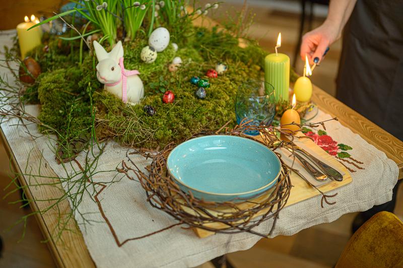 Лиене утверждает, что в этом году ее пасхальный стол будет именно таким. Дикий, хаотичный, насыщенный мхом и зеленым цветом, композиции с бархатными зайчиками, душистыми гиацинтами, нарциссами и вербой. «Торжественность стола акцентирую при помощи пасхальных свечей. Весна – мое любимое время года, оно связано с возращением перелетных птиц, поэтому я сделаю гнезда из веток березы и помещу посередине тарелку. Такое убранство стола мне нравится больше всего, ведь для подобного оформления необходимо отправиться в лес - а это прогулка и свежий воздух.